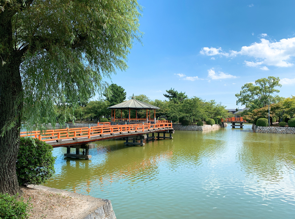 忠勝様像の前に広がる公園は旧桑名城跡地。今も残る池はかつてのお堀。